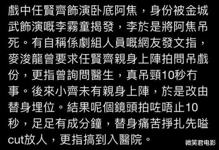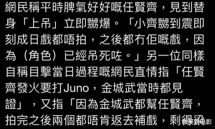 最后还是要强调一下,关于替身进医院和任贤齐、导演矛盾一事,都是港媒爆料,还没有实锤。
