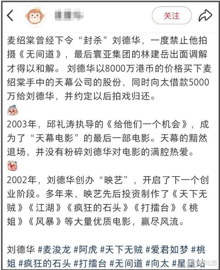 最著名的当属《无间道》剧组,当时《无间道》正在筹备阶段,刘德华是饰演刘建明的不二人选 。然而,麦家的封杀令让剧组陷入了两难的境地 。如果坚持启用刘德华,就面临着撤资的风险,整部电影可能会因此夭折;如果妥协,放弃刘德华,又会让影片失去一位极具票房号召力的演员 。在巨大的压力下,剧组一度陷入了僵局 。